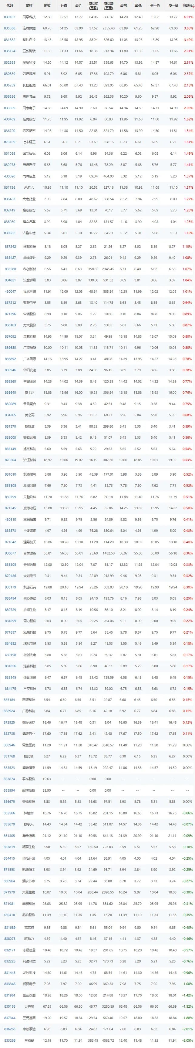 其中,同享科技(839167)涨幅居首,上涨6.91%;连城数控(835368)涨幅居次,上涨3.65%;生物谷(833266)下跌居首,下跌2.05%;中航泰达(836263)下跌居次,下跌2.01%。森萱制药(830946)、拾比佰(831768)等4只股票平盘。