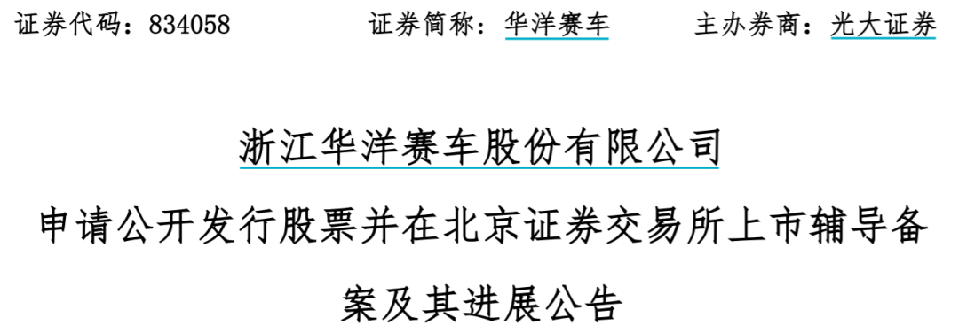 华洋赛车于2021年12月29日向中国证券监督管理委员会浙江监管局报送了辅导备案申请材料,辅导机构为光大证券股份有限公司。
