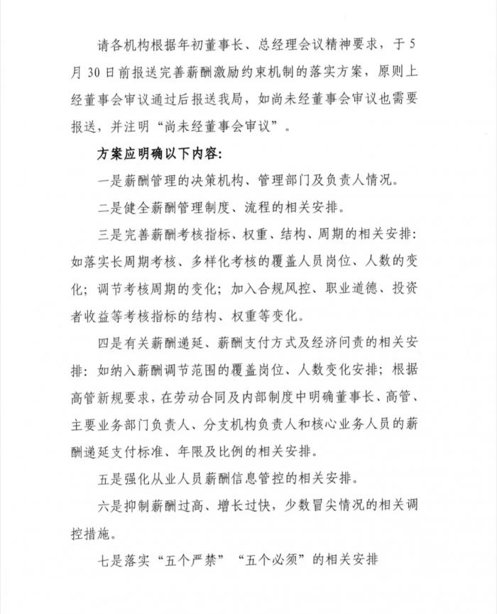 综合各方的消息,方案要求明确健全薪酬管理制度、流程,以及薪酬考核指标、权重、结构、周期等的相关安排;明确有关薪酬递延、薪酬支付方式及经济问责的相关安排;强化从业人员薪酬信息管控的相关安排等。