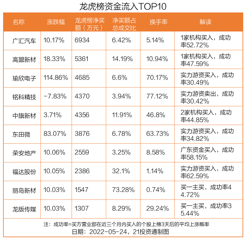 5月24日,上证指数下跌2.41%,深证成指下跌3.34%,创业板指下跌3.82%。盘后龙虎榜数据显示,共有46只个股因当日异动登上龙虎榜,资金净流入最多的是广汇汽车(600297.SH),达0.69亿元。