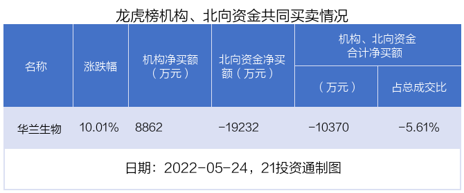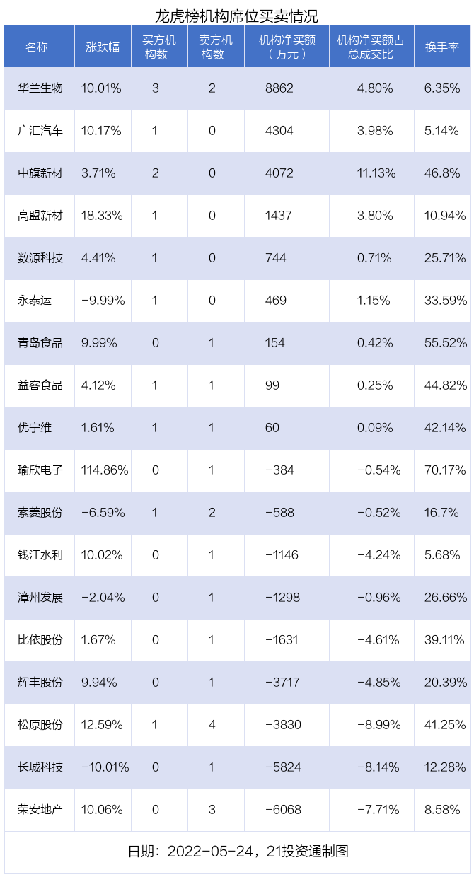 其中,机构净买入金额最多的是华兰生物(002007.SZ),当日收盘上涨10.01%,换手率为6.35%。前五大买卖营业部中有5家机构,为合计净买入8862万元,占总成交金额的4.80%。