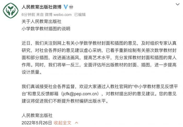 近日,我们关注到网上有关小学数学教材封面和插图的意见,及时组织专家认真研究,对社会各界好的意见建议虚心采纳,已着手重新绘制有关册次数学教材封面和部分插图,改进画法画风,提高艺术水平,充分发挥教材封面和插图的育人作用。同时,我们将举一反三,全面评估所出版教材的封面、插图,进一步提高设计质量。