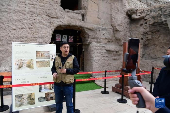 5月11日,云冈研究院工作人员孙波在云冈石窟第1窟进行文物保护专题直播。新华社记者杨晨光摄