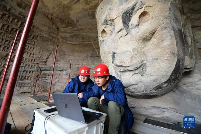 5月11日,在云冈石窟第17窟,工作人员在分析采集到的石窟数据信息。新华社记者杨晨光摄