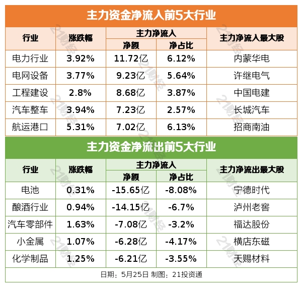 据21投资通(微信号ID:touzit21)智能监测,5月25日,北向资金净买入34.09亿元,其中沪股通净买入20.45亿元,深股通净买入13.65亿元。增持电力行业,减持酿酒行业。
