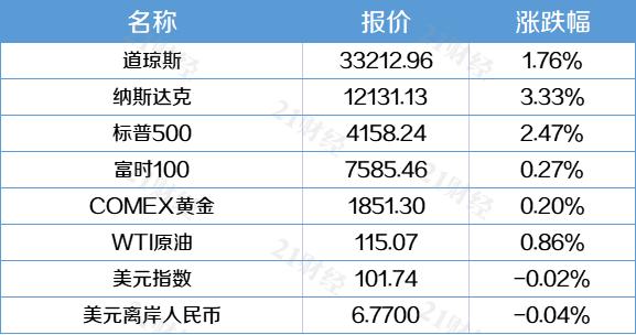 美国三大股指全线收涨,终结多周连跌走势。道指周涨6.24%,终结8周连跌;纳指周涨6.84%,终结7周连跌;标普500周涨6.58%,终结7周连跌,并创2020年11月以来最大单周涨幅。