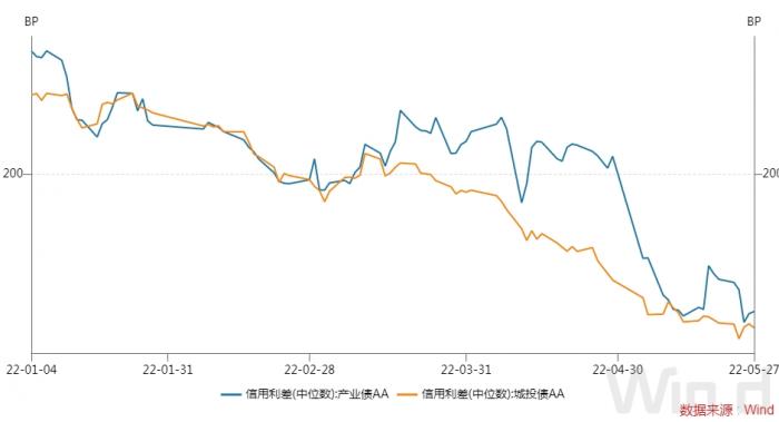 高认购倍数外,信用债一级市场发行利率也持续下行。以3年期中票为例,5月AAA、AA+、AA发行人的加权平均发行利率分别为2.89%、3.39%、3.93%,环比上月分别下降27BP、44BP、77BP,较2021年12月分别下降了43BP、60BP、102BP,低评级的中票融资成本下降最多。