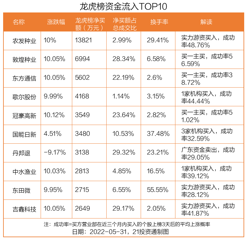 5月31日,上证指数上涨1.19%,深证成指上涨1.92%,创业板指上涨2.33%。盘后龙虎榜数据显示,共有66只个股因当日异动登上龙虎榜,资金净流入最多的是农发种业(600313.SH),达1.38亿元。