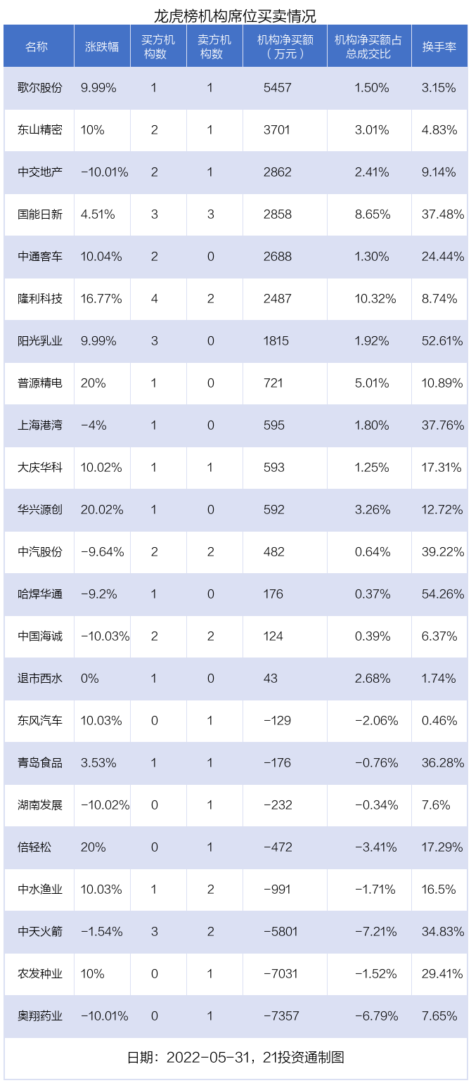 其中,机构净买入金额最多的是歌尔股份(002241.SZ),当日收盘上涨9.99%,换手率为3.15%。前五大买卖营业部中有2家机构,为合计净买入5457万元,占总成交金额的1.5%。