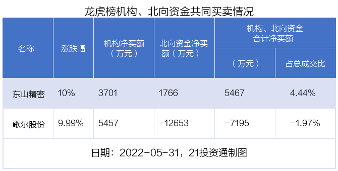 值得注意的是,机构和北向资金共同净买入了东山精密;在歌尔股份上出现分歧,机构净买入歌尔股份5457.38万元,北向资金净卖出1.27亿元。