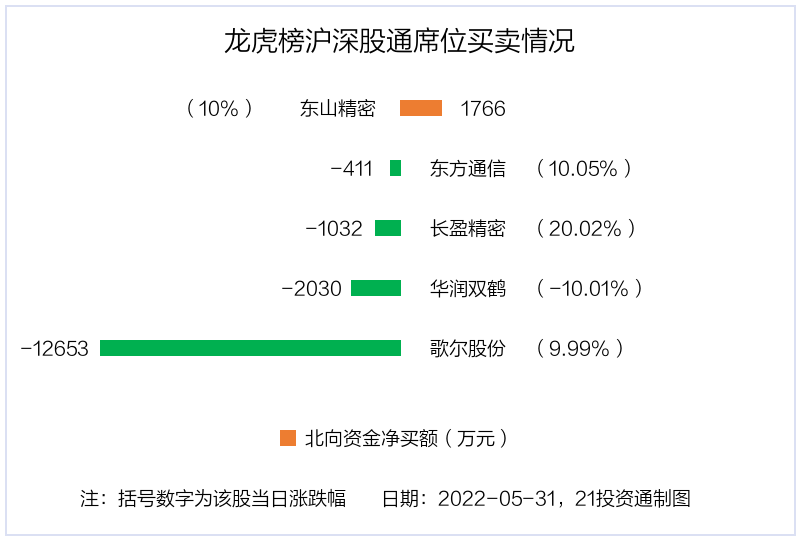 5月31日,北向资金参与龙虎榜中的个股共有5只,合计净卖出1.44亿元。其中沪股通净卖出2 股,合计净卖出2440.08万元;深股通净买入1 股,净卖出2 股,合计净卖出1.19亿元。