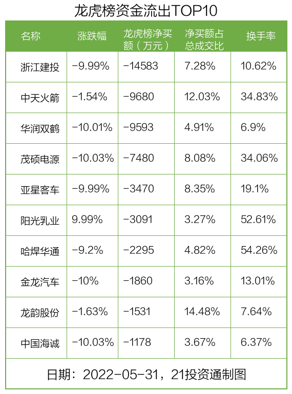 而龙虎榜中资金净流出最多的是浙江建投(002761.SZ),被净卖出为1.46亿元,占总成交金额的7.28%。其中中国银河证券大连金马路净卖出7894万元,华福证券南京苏源大道5442万元。浙江建投收盘下跌9.99%,换手率为10.62%。