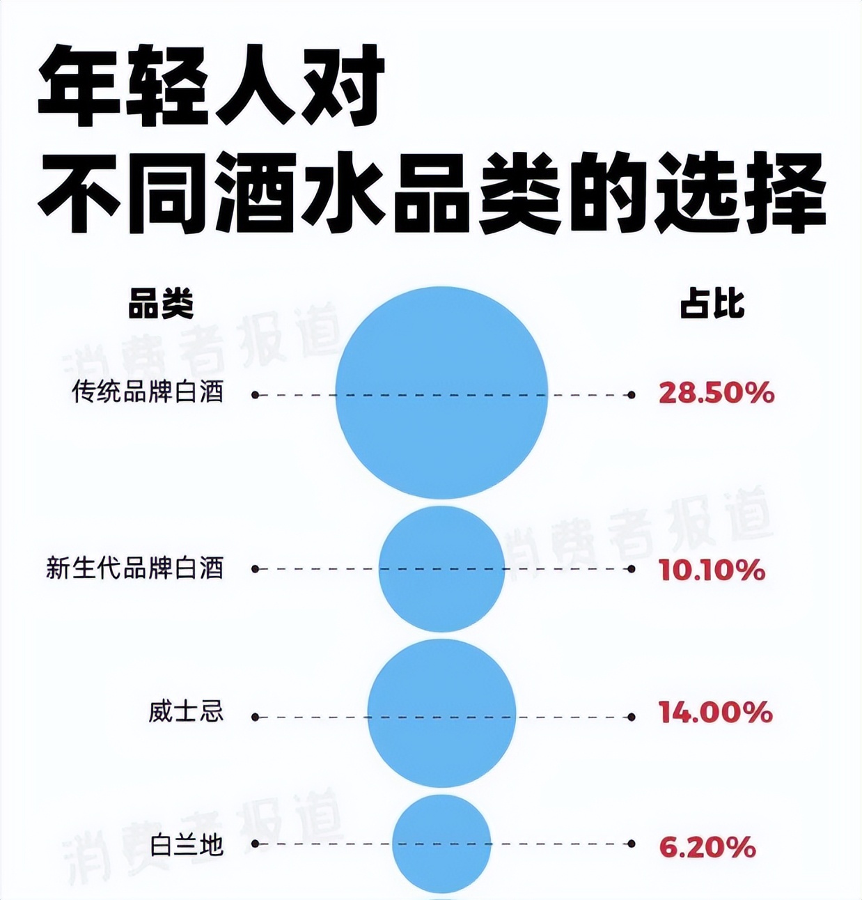 根据腾讯营销洞察《2021白酒行业数字营销洞察白皮书》显示,年轻群体对白酒的接受程度普遍较低。《消费者报道》今年2月发起的《年轻人饮酒习惯调查问卷》显示,41.9%的年轻消费者选择葡萄酒,40%的选择啤酒,白酒以38.6%选择率排在第三位(传统白酒28.5%、新生代白酒10.1%)。