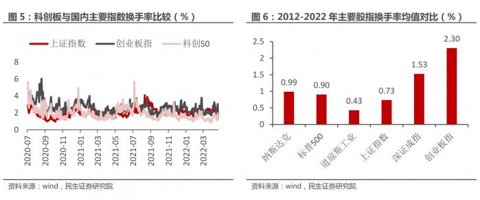 但回顾科创板开市以来表现,若选择换手率作为指标考量,能够看到随着新开市的效应逐渐减退,科创板换手率总体呈下降趋势,2022年以来科创50平均换手率1.86%,对比来看上证、深证指数、创业板指换手率分别为2.13%、2.64%、2.51%。