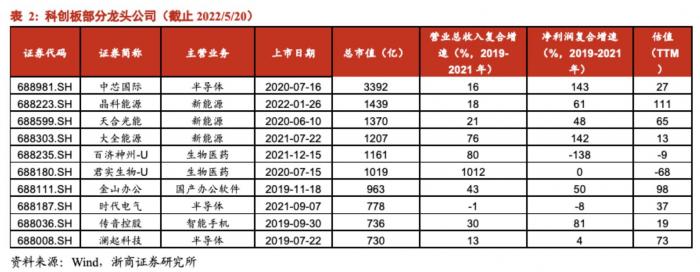 截至5月20日,以科创板的市值前10大公司为例,中芯国际、晶科能源、天合光能、大全能源、百济神州-U等,都是半导体、新能源、生物医药等领域的细分领域龙头代表。