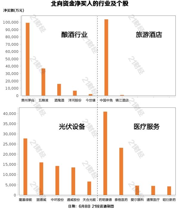 个股方面,北向资金净买入中国中免(601888.SH)、贵州茅台(600519.SH)、伊利股份(600887.SH)、药明康德(603259.SH)、五粮液(000858.SZ)居前,其中,中国中免被净买入10.40亿元,贵州茅台被净买入9.93亿元,伊利股份被净买入4.44亿元,药明康德被净买入4.09亿元,五粮液被净买入3.69亿元。
