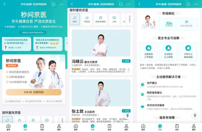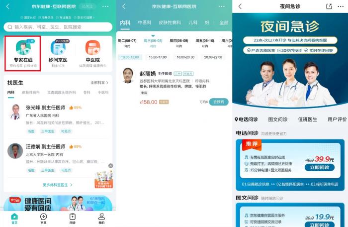 近日,针对细分场景下用户健康需求和线上问诊习惯的洞察,京东健康整合优质医疗健康资源,推出“专家在线”、“秒问京医”、“夜间急诊”三项在线问诊服务。