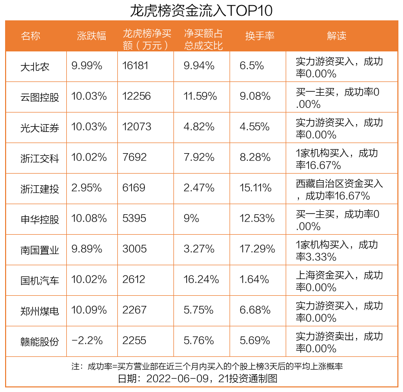 6月9日,上证指数下跌0.76%,深证成指下跌1.85%,创业板指下跌2.95%。盘后龙虎榜数据显示,共有67只个股因当日异动登上龙虎榜,资金净流入最多的是大北农(002385.SZ),达1.62亿元。