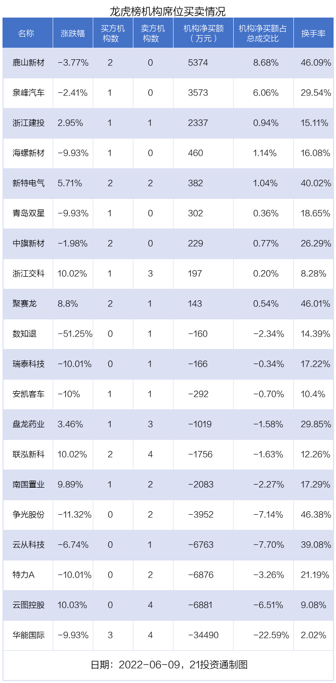 6月9日,20只个股龙虎榜出现了机构的身影,机构合计净卖出5.14亿元。具体来看,机构净买入9股,净卖出11股。