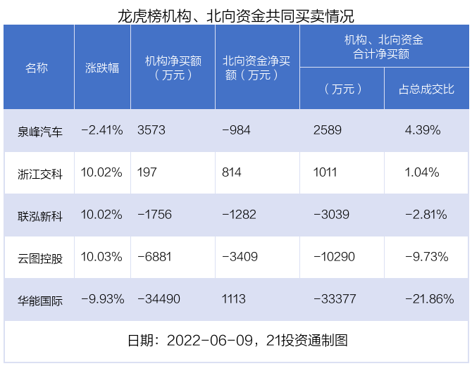 值得注意的是,机构和北向资金共同净买入了浙江交科;共同净卖出了联泓新科,云图控股;在华能国际,泉峰汽车上出现分歧,机构净卖出华能国际3.45亿元,北向资金净买入1113.18万元;机构净买入泉峰汽车3572.78万元,北向资金净卖出983.78万元。