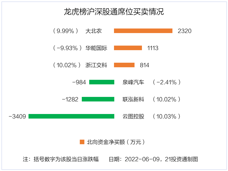 6月9日,北向资金参与龙虎榜中的个股共有6只,合计净卖出1427.81万元。其中沪股通净买入1 股,净卖出1 股,合计净买入129.4万元;深股通净买入2 股,净卖出2 股,合计净卖出1557.21万元。
