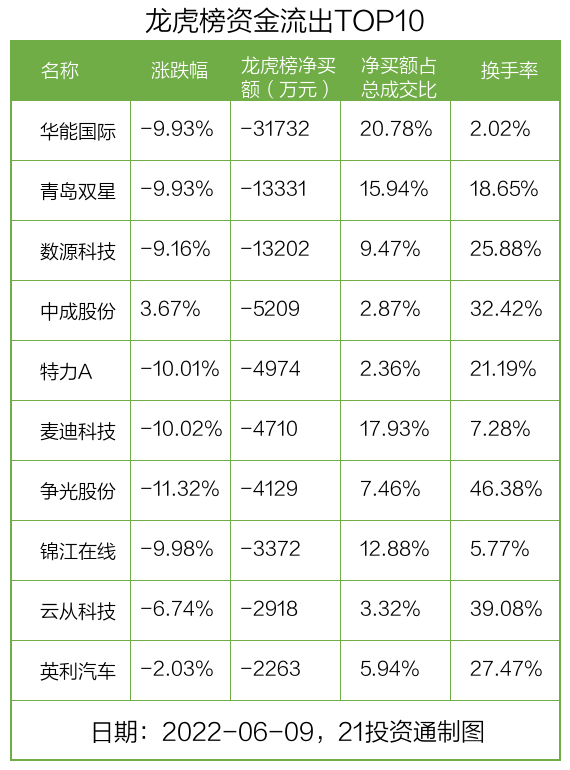 而龙虎榜中资金净流出最多的是华能国际(600011.SH),被净卖出为3.17亿元,占总成交金额的20.78%。华能国际收盘下跌9.93%,换手率为2.02%。