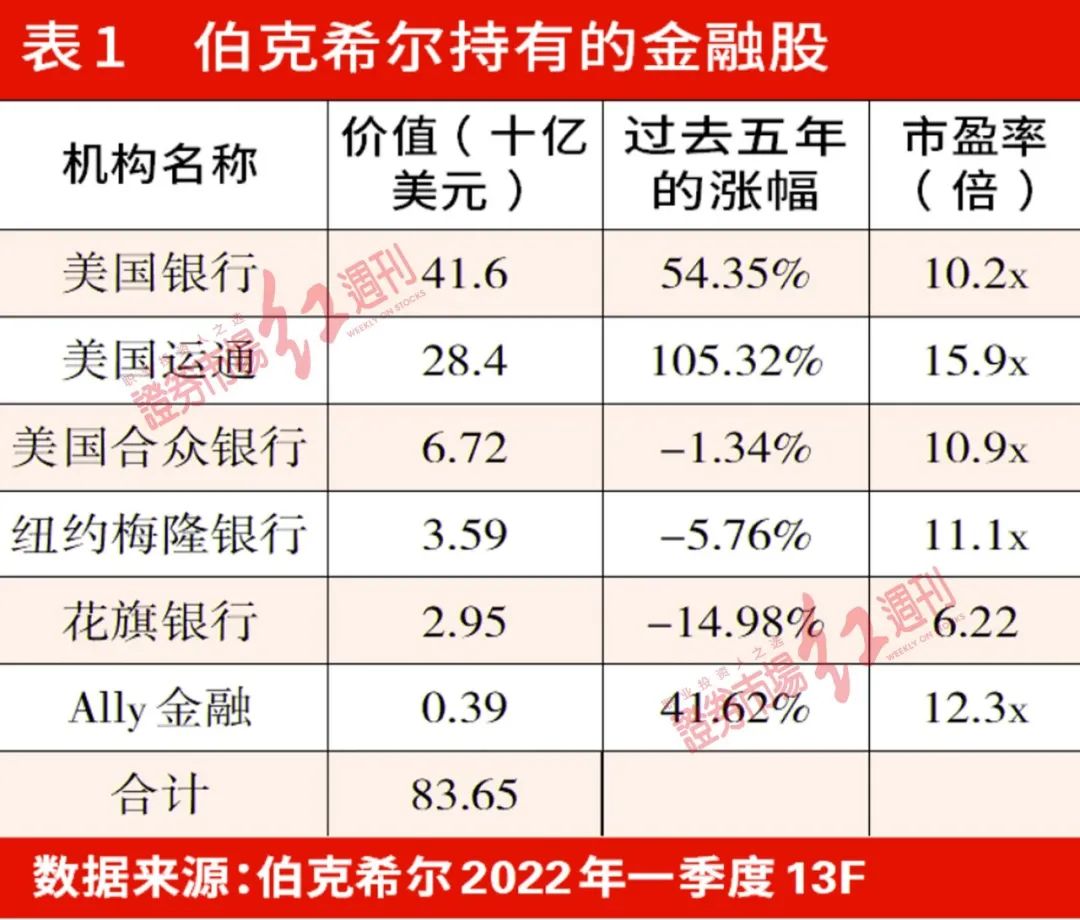 在新冠疫情前接受采访时,巴菲特也提道,“投资银行股不会是一个全垒打,但我觉得长期看跑赢大盘问题不大”。截至2022年3月底,伯克希尔旗下的金融股(没有计入评级机构和信用卡发行商)总价值达到了837亿美元,占其整个投资组合的23%。其中巴菲特在一季度花费近30亿美元新买入的花旗银行,相较于持有的其他银行等金融股标的,则属于“独一无二”的存在。
