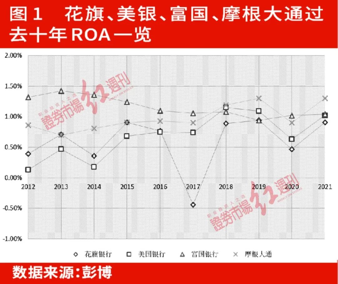 要知道,刚刚过去的一季度,摩根大通已经实现了17%的ROTCE,而花旗银行告诉投资者几年之后才能达到12%,那么大幅折价也就不难理解了。除此之外,美国银行和摩根大通的有效性比例(成本/营收)都已经到了60%以下,而花旗银行的中期目标是向60%移动,努力实现行业平均水平。最后,巴菲特说过,他最关注的银行盈利能力指标是资产回报率ROA。我们不妨拿花旗与美银、摩根和富国三家银行做个对比。