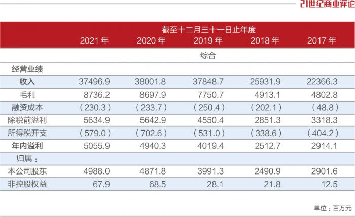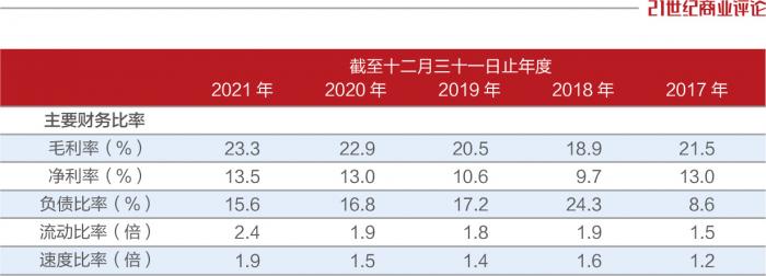 从财务数据来看,公司在2021年毛利约87.36亿元,毛利率约为23.3%,略有提升0.4个百分点;净利率约13.5%,同比增长2.3%。