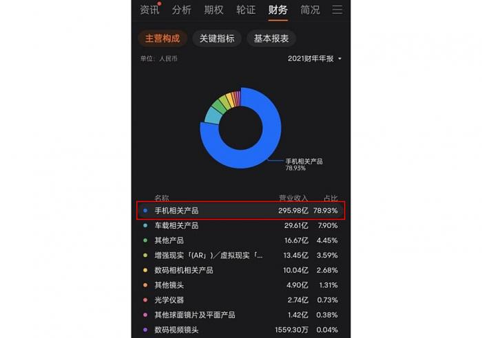 据其2021年报,全年收入374.97亿元,同比减少1.3%。公司解释为终端需求疲软,手机镜头出货量为14.4亿件,较去年减少5.9%。
