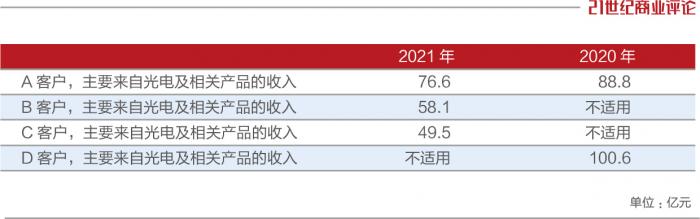 华为曾经是其第一大客户。舜宇光学财报显示,2019年,占比最大的A客户营收为146.48亿,占比达38.75%,2020年,该客户收入降至100.64亿,到2021年,则已不在前4名之列,且收入占比低于10%。