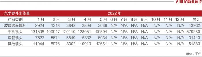按照今年1-5月数据,其手机镜头出货量总计为579280个,累计较去年减少51985个,下滑主要缘于智能手机需求惨淡。