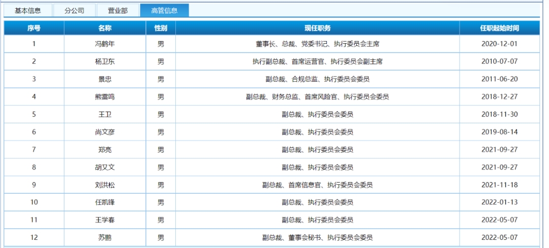 中证协网站信息显示,除了冯鹤年之外,目前民生证券还有11名高管。其中杨卫东任公司执行副总裁、首席运营官;景忠任副总裁、合规总监;熊雷鸣为副总裁、财务总监、首席风险官;刘洪松为副总裁、首席信息官;苏鹏任董秘兼副总裁。
