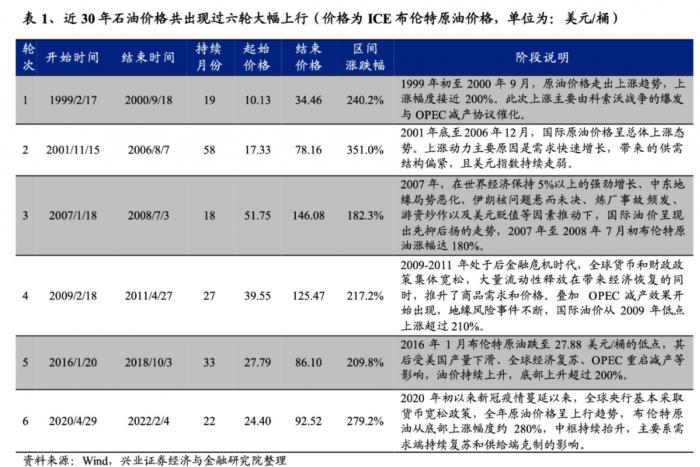 兴业证券通过复盘发现,原油价格大幅上涨时期往往伴随着全球经济复苏和各主要经济体货币和财政政策宽松,股市往往表现较好。近30年以来,国际油价共出现过六次大幅上行的阶段,涨幅多处于200%-300%的区间。从历史经验来看,原油价格波动较大,同时供给收紧、流动性宽松等因素往往使得油价出现超预期上行。
