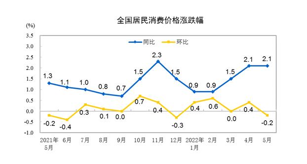 5月份,国内疫情防控形势持续向好,消费市场供应总体充足,CPI环比转降,同比涨幅保持稳定。