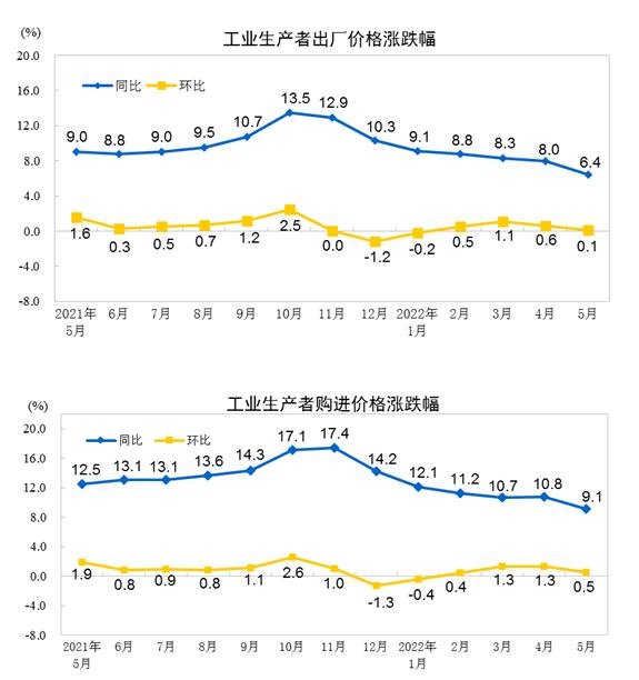 2022年5月份,全国工业生产者出厂价格同比上涨6.4%,环比上涨0.1%;工业生产者购进价格同比上涨9.1%,环比上涨0.5%。1—5月平均,工业生产者出厂价格比去年同期上涨8.1%,工业生产者购进价格上涨10.8%。