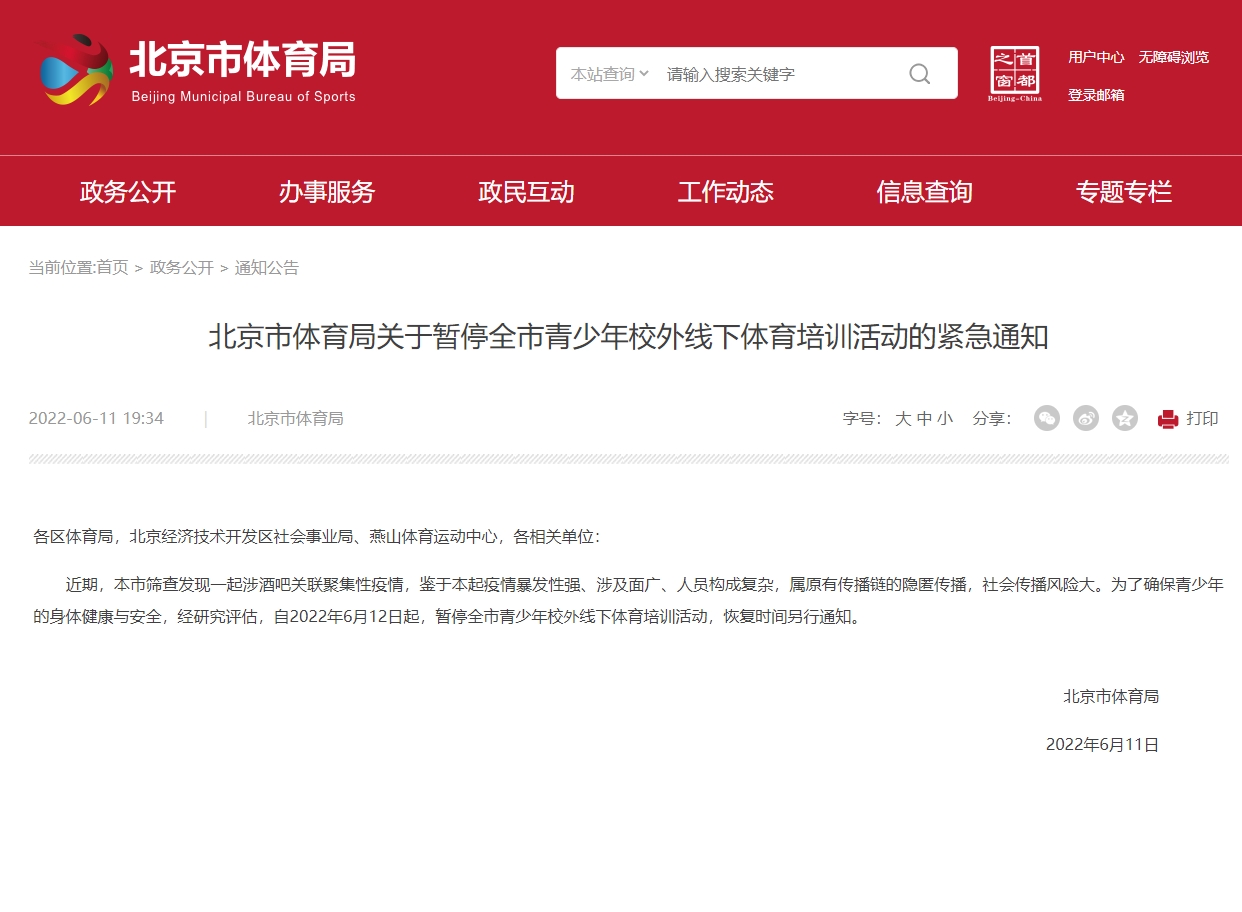 北京各区体育局,北京经济技术开发区社会事业局、燕山体育运动中心,各相关单位:近期,北京市筛查发现一起涉酒吧关联聚集性疫情,鉴于本起疫情暴发性强、涉及面广、人员构成复杂,属原有传播链的隐匿传播,社会传播风险大。为了确保青少年的身体健康与安全,经研究评估,自2022年6月12日起,暂停北京市青少年校外线下体育培训活动,恢复时间另行通知。