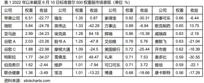 表1为标准普尔500指数中的权重股,其中,许多企业也是行业的龙头股,这32只股票累计权重为44.48%,具有良好的代表性,其市场表现很好地注解了股票市场正发生的重要变化。科技巨头取代了传统行业股票成为市值最大的公司,其市场表现左右了整个大市。然而,苹果公司在发布第一季度业绩时就警告第二季度面临挑战,原因之一是供应链吃紧;微软前不久发布第二季度业绩预警,预计汇率波动将令本季度销售额低于预期;受网络广告业务收入下降影响,谷歌和脸书业绩遭遇下滑,脸书的人工智能部门已暂停纳新;亚马逊4月就发出盈利警告,目前正在收缩仓储业务;受供应链紊乱影响,特斯拉盈利前景较为暗淡。被美国政府视为战略行业的半导体表现普遍较差,明星股英伟达5月发布预警,称本季度收入或将低于预期,公司正放慢招聘业务,力求控制成本。