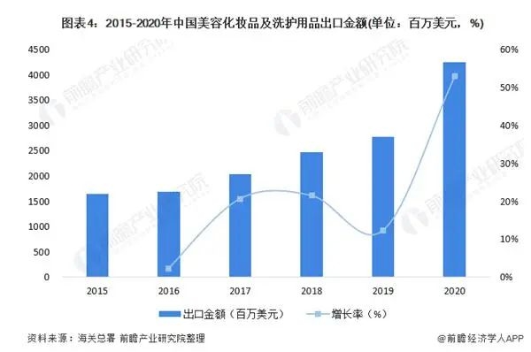 据前瞻产业研究院报告指出,2020 年中国美容化妆品及洗护用品出口量为 999019 吨,同比增长 4.3%,出口金额为 4243.92 百万美元,同比下降 11.2%。在出海的美妆产品当中,口红、眼影、腮红是最热门品类,睫毛膏、粉饼则有较大发展潜力。
