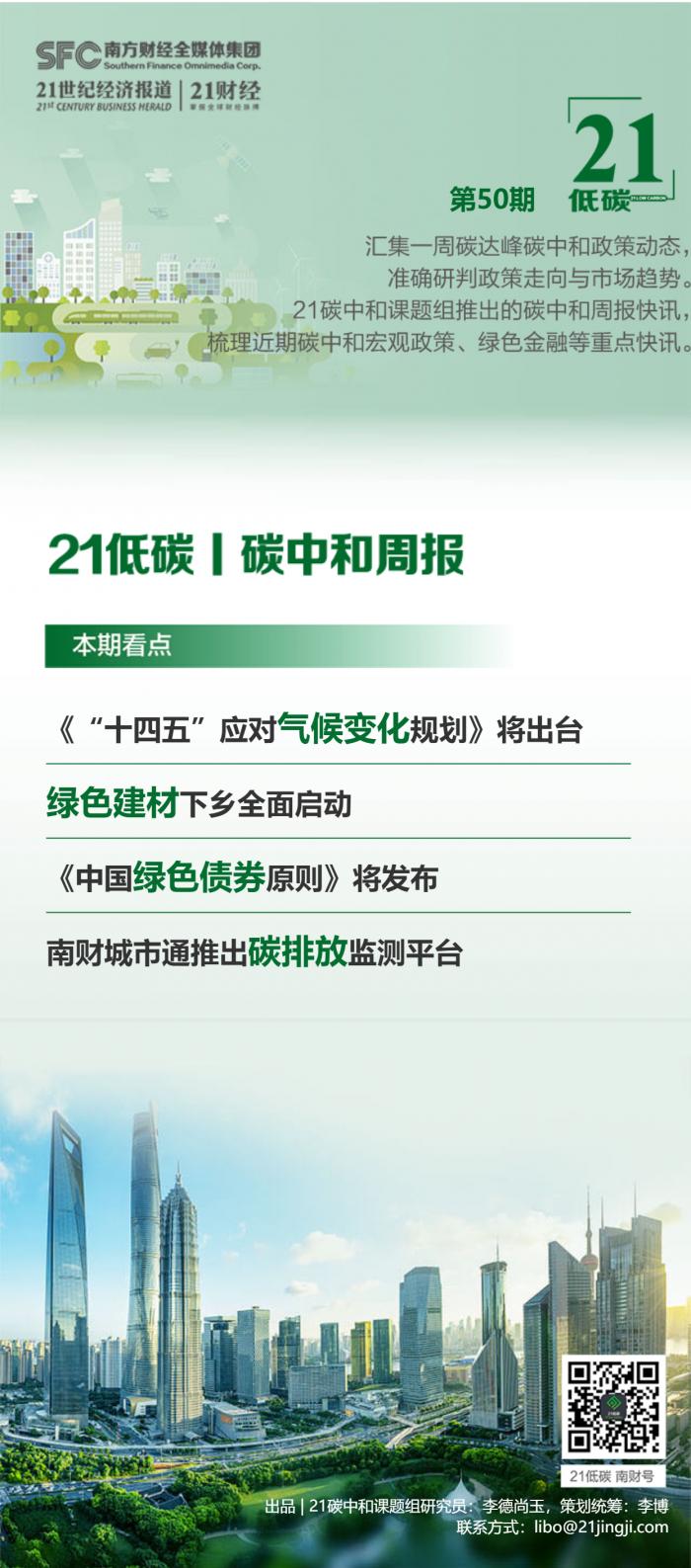 本期看点:孙金龙:完善绿色低碳政策体系,出台《“十四五”应对气候变化规划》;绿色建材下乡全面启动:浙江获批首个试点,津鲁川积极申报;绿标委将适时发布《中国绿色债券原则》;南财城市通3.0上线:碳排放监测平台助力城市“双碳”目标达成。