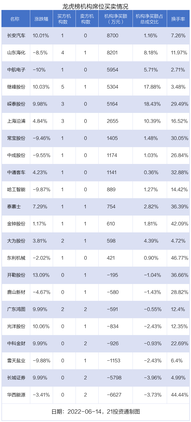 6月14日,22只个股龙虎榜出现了机构的身影,机构合计净买入2.63亿元。具体来看,机构净买入14股,净卖出8股。