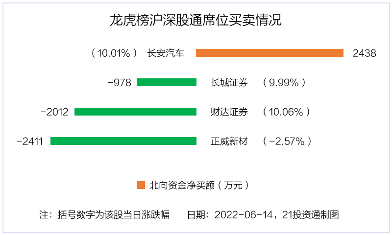 值得注意的是,机构和北向资金共同净买入了长安汽车;共同净卖出了长城证券。