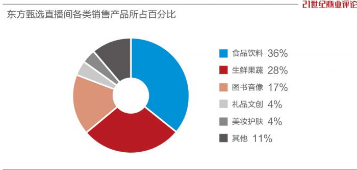 从品类来看,东方甄选直播间销售的主要为食品饮料和生鲜果蔬,分布依次为食品饮料(36%)、生鲜果蔬(28%)、图书音像(17%)、礼品文创(4%)、美妆护肤(4%)、其他(11%)。