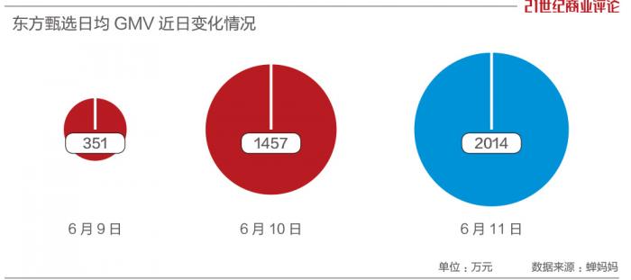 据统计,5月,东方甄选日均GMV仅88万元;6月9日至11日,GMV突飞猛进,分别为351万、1457万以及2014万元。