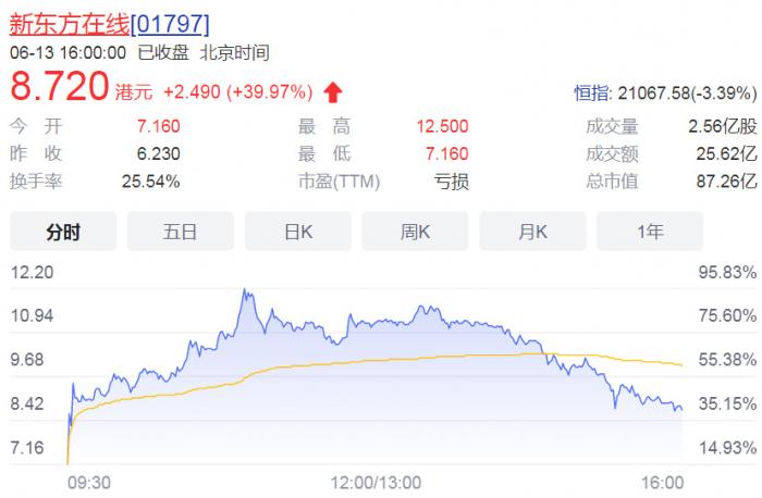 6月13日,新东方在线的股价坐上云霄飞车,最高时暴涨100%,收盘回落至8.72港元,上涨40%。