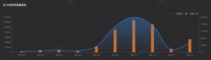 6月9日之后,销售额迅速攀升,最高的一次是6月11日,预估销售额为2000万元左右。