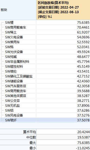 据本报6月13日统计,从4月27日至6月13日,申万227个最细分的行业平均反弹幅度为20.42%。其中,锂、商用载客车、稀土位居前三甲,区间平均涨幅为75.64%、70.45%和61.92%。
