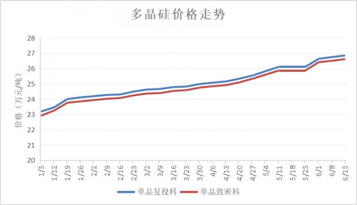 至此,在因前段时间“无料可签”一度滞涨之后,硅料价格再度进入持续上升的通道。即便微涨,在与年初相比,今年以来的硅料价格涨幅亦是较为明显——单晶复投料每吨较年初涨了3.67万元,累计涨幅15.83%;单晶致密料每吨较年初涨了3.7万元,累计涨幅16.15%。