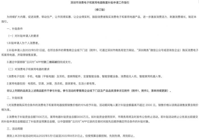 (深圳对消费电子和家用电器的补贴指引,图源:深圳市商务局官网发布)