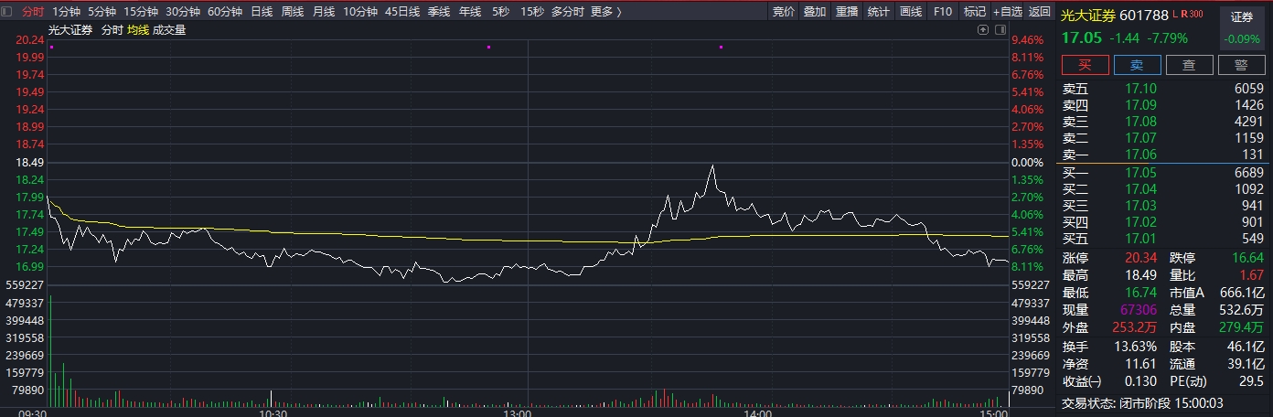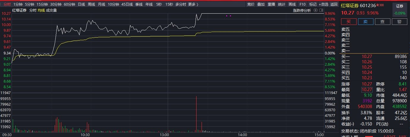 证券板块盘中一度拉升翻红,收盘时个股表现分化。红塔证券涨停,实现4天3板。光大证券盘中反攻未果,收盘大跌近8%。